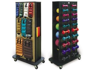 Consists of: (1) 5560 Rack, (1) 5581 Set of (16) Hugger® Weights, (1) 5531 Set of (5) REP Bands™, (2) 5505 Sets of (10) Dumbbells each